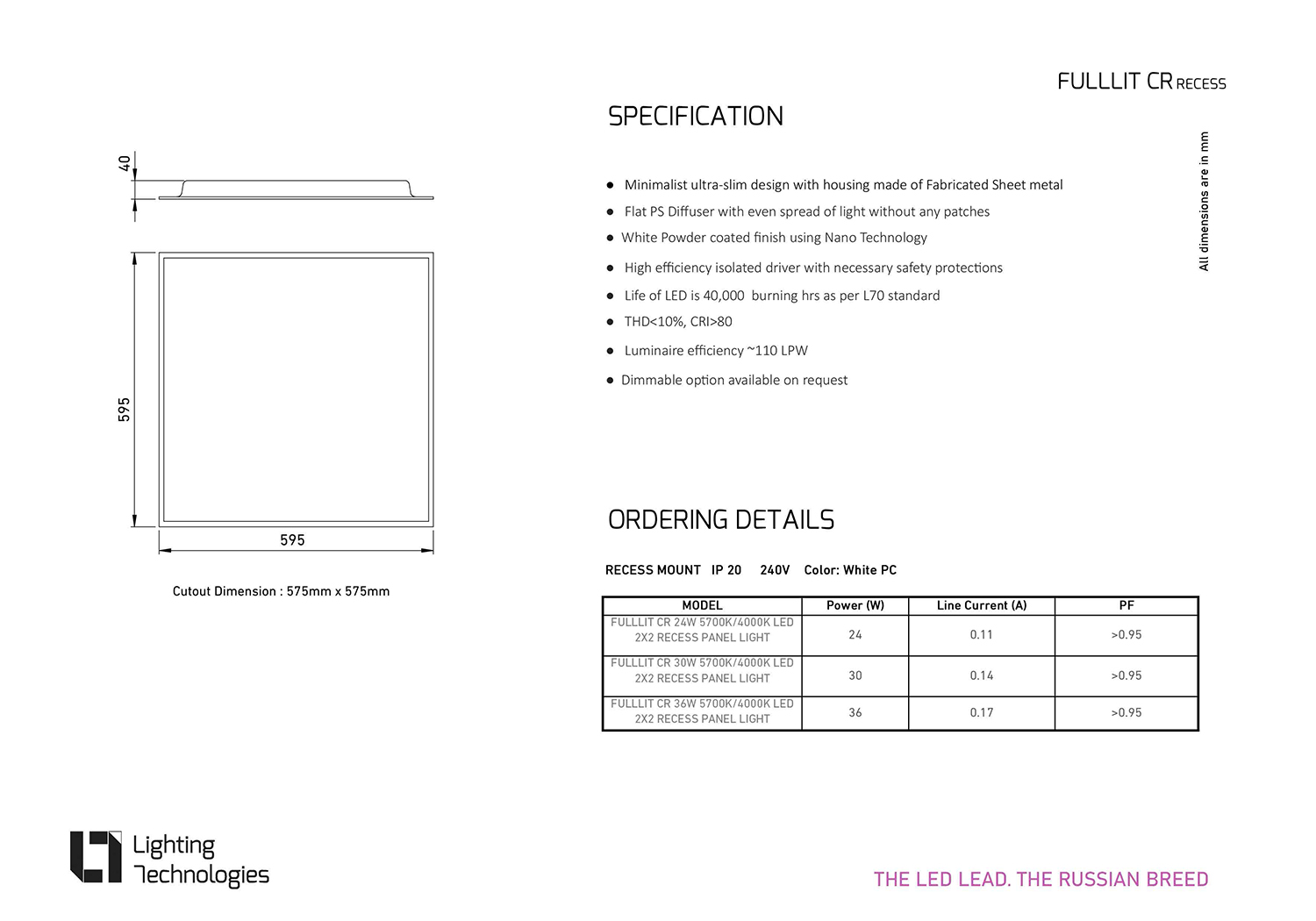 FULLLIT CR is a Ultra slim functional recessed 2ft x 2ft panel LED light best suited for work place which demands more light at low investment costs.
